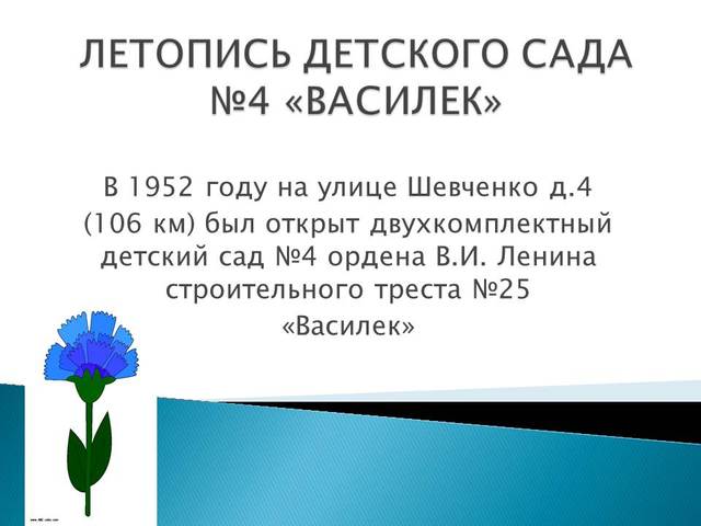 Шефство над детским садом «Василек» взяло строительное управление №3. Начальником СУ-3 был Потапов. На участке детского сада были 2 игровые площадки по 50 кв.м., стояли деревянные веранды и песочницы. Шефы помогли в оформлении участков малыми формами: установили домики, лодку, пароход, стенку для лазания, мишени, дуги, бумы, гимнастические скамейки. Участок был хорошо озеленен, выделены уголки леса, сада, оформлены цветники, огороды.
