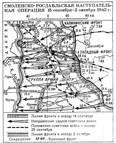 15 сентября 1943 года армии Западного фронта перешли в наступление. Основной удар в направлении Починок-Орша наносился силами 10-й гвардейской, 21-й и 33-й армий. В первый день операции главная полоса обороны противника была прорвана почти на всех направлениях. Наступавшим войскам оказывали помощь партизаны. Нем.-фаш. командование было вынуждено начать отвод осн. сил группы армий "Центр" к Смоленску.