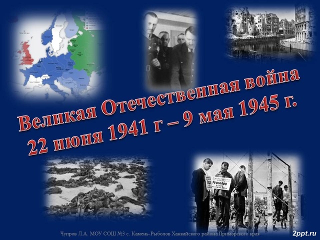 Великая Отечественная By Tаня 2 Jun 22, 1941 Вероломное нападение фашистской Германии на СССР Period: Jun 22, 1941 to May 9, 1945 Великая Отечественная Война Sep 30, 1941 Битва за Москву 30 сентября - начало Московского сражения. Jul 17, 1942 Оборона Сталинграда коренной перелом в ходе ВОВ Jul 12, 1943 Танкове сражение под Прохоровкой 5 июля - 23 августа - Курская битва. Apr 30, 1945 Битва за Берлин 16 апреля - 8 мая - Берлинская операция.
