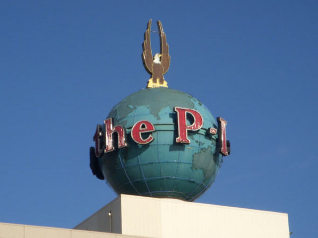 The 18.5 ton globe is dismantled and moved from the P-I%u2019s previous building to its current location near the Seattle waterfront. Photo: P-I headquarters, 2008. Courtesy Wikipedia.