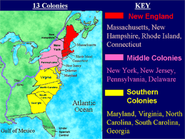13 colonies By 529899. 1607 virginia 1620 massachusetts 1626 New york 1634 maryland 1636 rhode island 1636 connecticut 1638 new hampshire 1638 delaware 1653 north carolina 1663 south carolina 1664 new jersey 1681 pennsylvania 1732 georgia 2001 New York 911 2007 virginia virginia tech