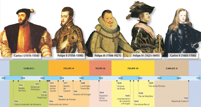1474-1700 By facebooker_2084036878285100 1469 Matrimonio de los Reyes Católicos 1486 Sentencia Arbitral de Guadalupe 1492 Conquista de Granada 1492 Expulsión de los judíos 1492 Descubrimiento de América 1494 Tratado de Tordesillas 1504 Conquista de Nápoles 1505 Leyes de Toro 1512 Leyes de Burgos 1515 Incorporación de Navarra a Castilla 1516 Carlos I es nombrado rey 1520 Levantamiento de las Comunidades y las Germanias 1524 Creación Consejos de las Indias 1542 Leyes Nuevas de Indias 1547 Batalla de Mühlberg 1555 Paz de Augsburgo 1556 Felipe II es nombrado rey 1564 Madrid es nombrada capital 1571 Batalla de Lepanto 1588 Armada Invencible contra Inglaterra 1598 Felipe III es nombrado rey 1609 Decreto expulsión de los moriscos 1618 Guerra de los 30 años 1621 Felipe IV es nombrado rey 1640 Rebeliones Portugal y Cataluña 1648 Paz de Westfalia 1652 Independencia Portugal 1659 Paz de Los Pirineos 1665 Regencia de Mariana de Austria 1675 Fin de la regencia de Mariana de Austria 1700 Muerte de Carlos III (sin descendencia)