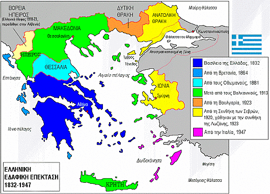 Ελληνική εδαφική επέκταση 1832-1947 By Βασίλης 1832 Στερεά Πελοπόννησος Κυκλάδες πρώτα ελεύθερα εδάφη 1864 Παραχώρηση Επτανήσων από Άγγλους 1881 Προσάρτηση Θεσσαλίας-Ν.Άρτας 1913 Μακεδονία Ήπειρος Κρήτη ν.Β.Αιγ. απελευθέρωση 1920 Προσάρτηση Δ.Θράκης 1948 Ένωση Δωδεκανήσων