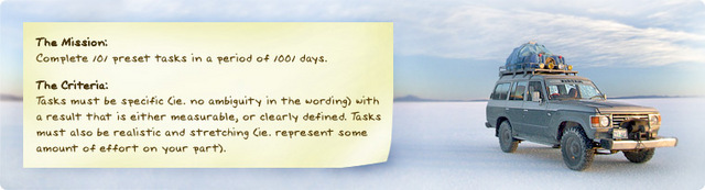 101 in 1001 By kerresa Apr 24, 2010 39. Go to Terry's prom Jun 17, 2010 58. Go to the beach and enjoy the sand, for once Jul 1, 2010 50. Take an unplanned roadtrip Went with my mom and Rachel to Galveston