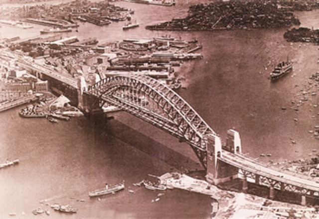 The steel cables which were anchoring the two halves were loosened and both sides of the Bridge were lowered to allow them to be bolted into place. The first of two major phases was complete and it was celebrated with a half-day holiday and a bonus of two shillings for the bridge workers
