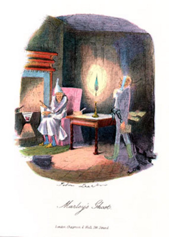 We meet Ebeneezer Scrooge on Christmas eve. He is met by a ghostly spectre of his partner Jacob Marley, who appears as his door-knocker.