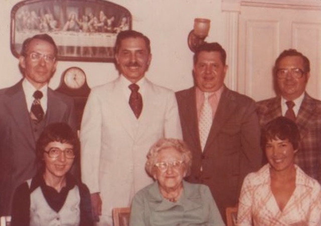Group picture, Grandma Mertie (in the middle) with Dad, Uncle Bruce, Uncle Cliff, Uncle Jess, Aunt Mary, and Aunt Carol