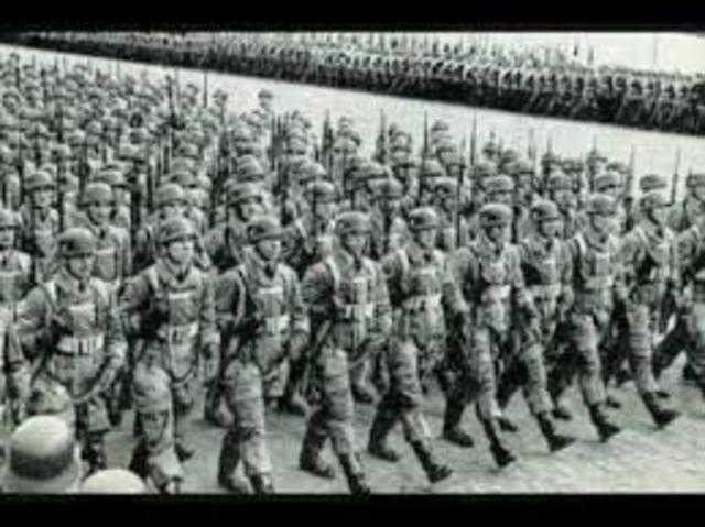 Hitler violates The Treaty of Versalies. He sends troops into the Rhineland.