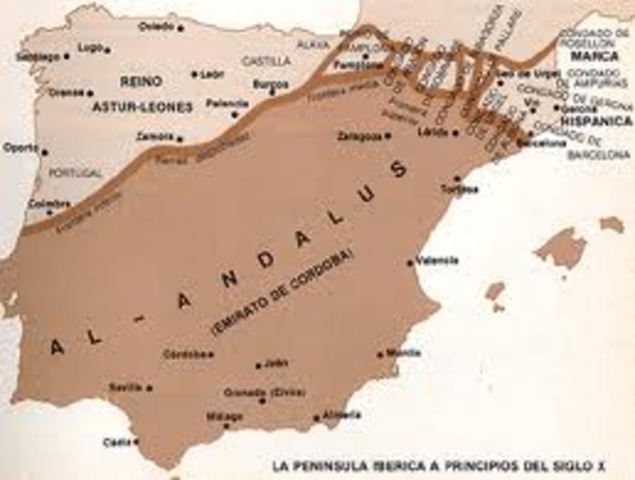 La conquista musulmana se inició en el 711, cuando Tarik (gobernador musulmán del norte de África) cruzó el estrecho de Gibraltar con una peueña tropa de árabes y bereberes.