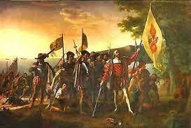Group of a 102 pilgrims sailed from England to "the New World" on the Mayflower. The Pilgrims left England because they wanted religious and political freedom.The long, difficult journey across the Atlantic Ocean continued for 65, days. There were storm on the way and water entered the ship, but the pilgrims decided to continued on to the New World.