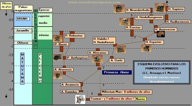 ÁRBOL GENEALÓGICO DE LOS HOMÍNIDOS By pegomo50 Jan 1, 1901 Ardipithecus ramidus: -5 millones de años A. ramidus Jan 1, 1902 Australopithecus anamesis: -4 millones de años A. anamesis Jun 1, 1902 Australopithecus afarensis: -3'5 millones de años A. afarensis Jan 1, 1903 Antepasado sin datos: -3 millones de años Jun 1, 1903 Paranthropus aethiopicus: -2'5 millones de años P. aethiopicus Jan 1, 1904 Australopithecus africanus: entre -3 millones y -2 millones de años A. africanus Jun 1, 1904 Australopithecus garhi: -2'5 millones de años A. garhi Jan 1, 1905 Paranthropus bosei: entre -2 millones y -1 millón de años P. bosei Mar 1, 1905 Homo habilis: entre -2 y -1'5 millones de años H. habilis Mar 1, 1905 Homo rudolfensis: entre -2 y -1'5 millones de años Homo rudolfensis Jun 1, 1905 Paranthropus robustus: entre -1'5 y -1 millón de años P. robustus Jun 1, 1905 Homo ergaster: -1'5 millones de años H. ergaster Sep 1, 1905 Homo erectus: entre -1'5 y -0'5 millones de años H: erectus Jan 1, 1906 Homo antecessor: -800.000 años H. antecessor Mar 1, 1906 Homo heidelbergensis: entre -500.000 y -250.000 años H. heidelbergensis Sep 1, 1906 Homo rodhesiensis: entre -400.000 y -150.000 años H. rodhesiensis Jan 1, 1907 Homo neanderthalis: entre -280.000 y -28.000 años H. neanderthalis Mar 7, 1907 Homo sapiens: entre -150.000 y 2012 H. sapiens