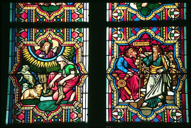 En ella, aparecen escenas ricas en iconografía dentro de unos medallones, que coinciden con la organización típica de las vidrieras de una catedral. -
