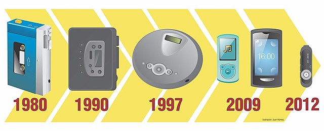 Tras el tocadiscos se fabricó el reproductor de cassette. En 1963, Phillips lanzó al mercado el primer cassette, lo que produjo que se empezaran también a diseñar equipos portátiles para reproducir su contenido. El Walkman (1979), por ejemplo, fue uno de estos equipos.