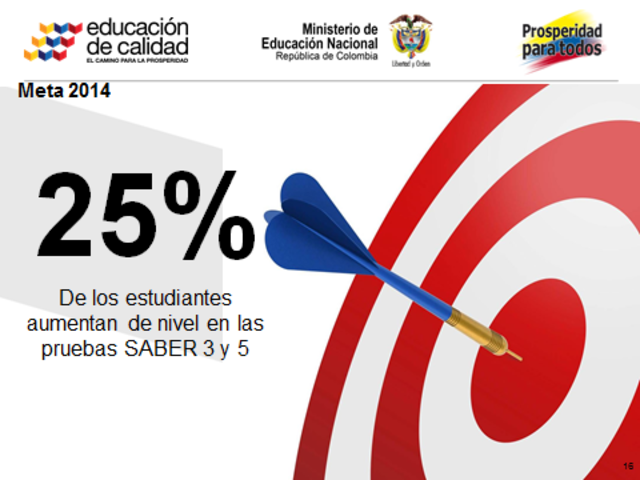 Meta: Mejorar las condiciones de aprendizaje en los Establecimientos Educativos seleccionados, evidenciado en el mejoramiento de las competencias básicas de los estudiantes matriculados entre transición y quinto grado. Más del 25% de los estudiantes de estos establecimientos educativos asciende de nivel, al menos en las áreas de Lenguaje y Matemáticas, en la prueba SABER 3 y 5 aplicación año 2014.