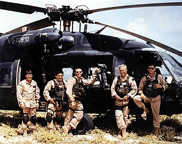 5) At 4:20 PM, the first helicopter crashed due to a rocket launcher shot by a Somali. two members aboard survived and started to defend the crash site.