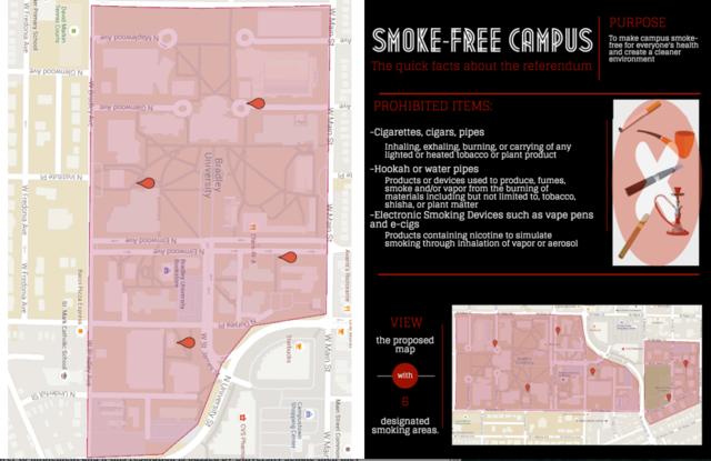 To help establish the new rules, SONOR painted foot prints 15 feet from all academic buildings. According to a CI News Now, SONOR has been activity working on making Bradley a smoke free campus. http://www.cinewsnow.com/news/local/Bradley-University-May-Become-Smoke-Free-118542729.html