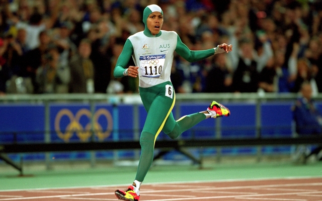 Cathy Freeman wins Gold medal in the 400m at the Sydney Olympics.