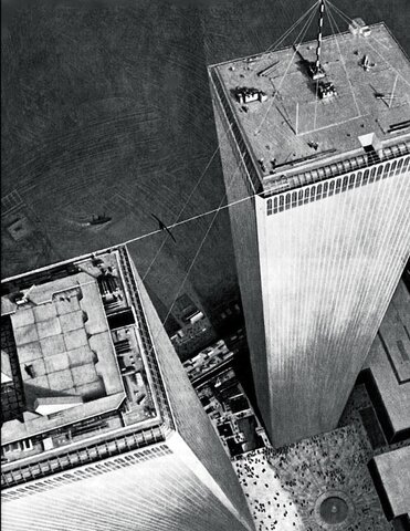 El 7 de agosto de 1974, poco después de las 7:15 de la mañana, Petit partió de la torre sur sobre su cable de acero. Con 24 años de edad, cruzó ocho veces entre las torres casi terminadas, a más de 400 metros sobre las aceras de Manhattan, en un evento que duró unos 45 minutos. -