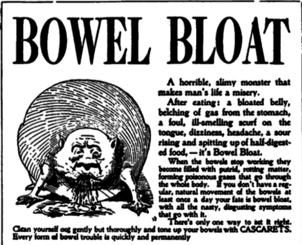 Autointoxication was basically all diseases. Research shows that it was the answer for about 90% of diseases and medical professionals were spreading word that constipation shortens your lifespan.