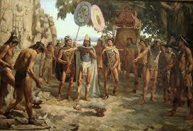 Llegada de Hernán Cortés a las costas mexicanas, se le confunde con Quetzalcóatl y le ofrecen regalos.