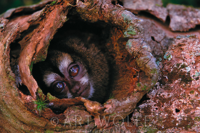 A night monkey peers out of its cavity in Islas Bocas del Toro, Panama. This image is part of renowned conservation photographer Art Wolfe's book "Vanishing Act." Wolfe has been one of the most influential conservation photographers of the past four decades and has taken over 1 million photos on all 7 continents. Vanishing Act showcases stunning camouflage abilities of animals with an underlying narrative of permanent vanishing acts due to habitat loss and human encroachment.