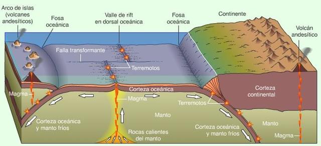 El fondo de los océanos se crea en las dorsales, se desplaza y se destruye en las zonas de subducción.