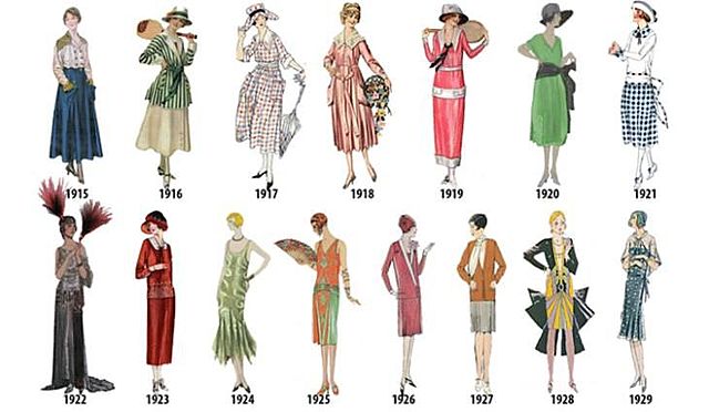 La moda en esta época representa la diversión y la libertad que había después de la guerra. Los vestidos sueltos, los tacones bajos, los sombreros y los flecos. Se deja de utilizar el corsé y el dobladillo llega por encima del tobillo.