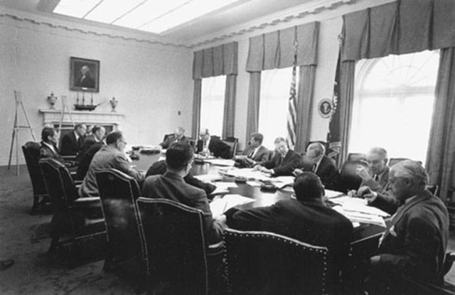 After his visits to Ohio and Illinois, John F Kennedy Returns to the White House and him and his assistants decide to make a blockade, wich was politically called a "quarintine".