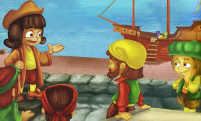 Cristobal sale del puerto de Palos, Huelva, con tres barcos llamados La Pinta, La Niña y La Santa María. Navegó hasta Canarias, y luego hacia el oeste, pasando por la isla de Guanahaní (San Salvador, en las Bahamas).