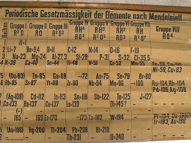 Dimitri Mendeléyev descubre la función periódica de la magnitud de su peso atómico. Ordena los elementos conocidos hasta el momento en una tabla similar a la actual dejando espacios para elementos entonces desconocidos.