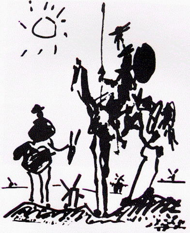 Don Quijote se confunde y ataca a unos molinos de viento creyendo que son gigantes