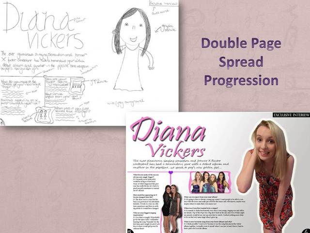 Similar to the top of the pops article, I also wanted to use a large graphic feature of the celebrity featured e.g. Diana Vickers in order for the audience to identify with her, so I placed an image of her onto my double page spread, making her one of the most predominant features. Other ideas which I used to create my own double page spread included using shapes such as hearts and lines to seperate big chunks of texts in order to maintain the interest of my target audience.