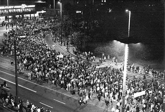 Pro-democracy demonstrations were held throughout east Germany. The protestors called for open borders and true democratic elections. this is demonstrated in their slogan "Wir sind das Volk" (we are the people). This slogan changed to "Wir sind ein Volk" (we are one people) when the demonstrations began demanding reunification. Monday Demonstrations webpage