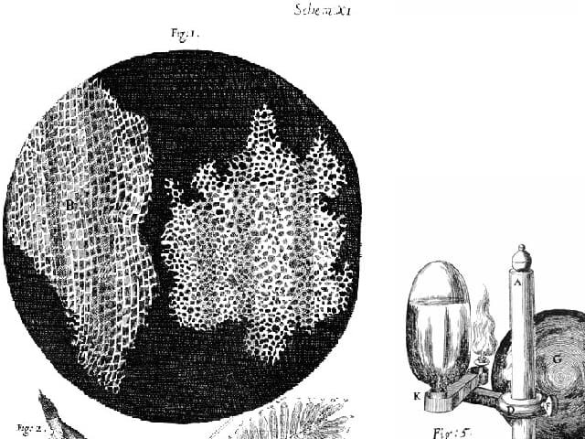 Quan Robert Hooke va observar amb un microscopi (que ell mateix havia fabricat) les làmines de suro que havia tallat, va veure uns porus, als que ell va anomenar cèl·lules. I encara que el que havia vist no eren les cèl·lules, era l’espai que havien deixat, avui en dia continuem utilitzant aquest nom. Els dibuixos van ser publicats per Robert Hooke l’any 1665 en un llibre anomenat “Micrographia”. -