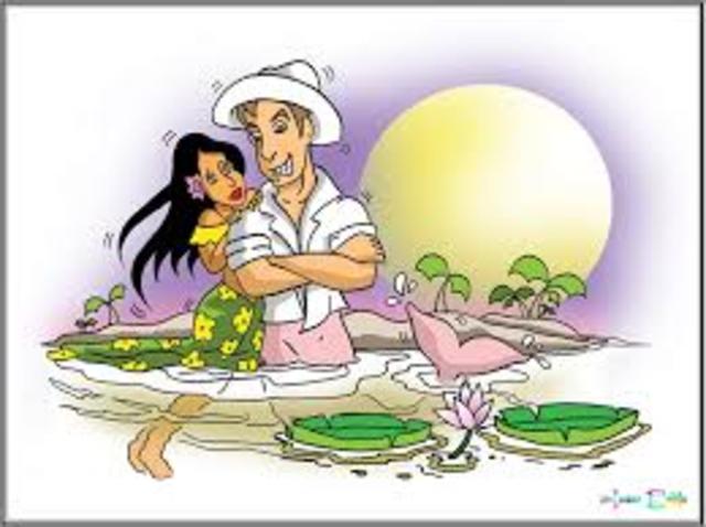 Por fin llegó el esperado día. Durante la fiesta, los invitados bailaban y celebraban alegres el cumpleaños de la hija del cacique. Cuando se hizo de noche, llegó al caserío un hombre que nadie conocía, vestía túnica blanca y sombrero, y era muy apuesto. Los hospitalarios habitantes decidieron acogerlo en la fiesta y preguntarle al día siguiente de dónde venía y hacia dónde iba.