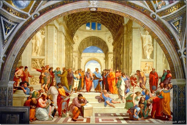 La escuela de Atenas (en italiano, Scuola di Atene) es una de las pinturas más destacadas del artista renacentista italiano Rafael Sanzio.1 Fue hecha en boceto entre 1509 y 1510 y pintada entre 1510 y 1512 como parte de una comisión para decorar con frescos las habitaciones que hoy en día son conocidas como las estancias de Rafael, ubicadas en el Palacio Apostólico de la Ciudad del Vaticano. -