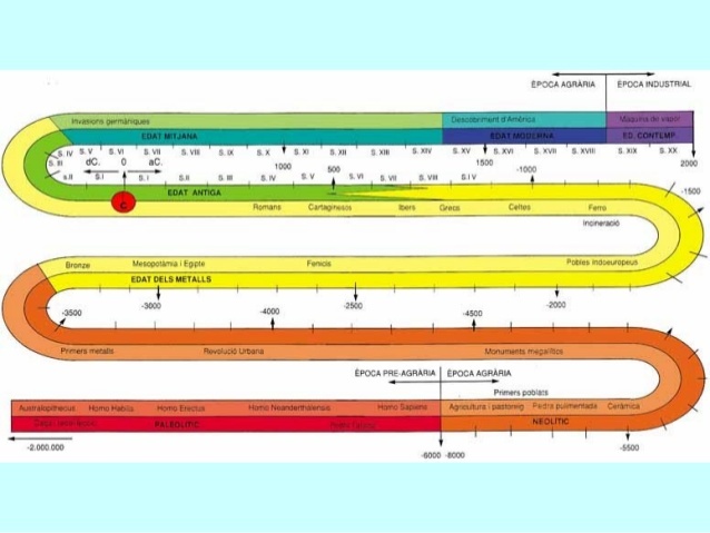 Està dividit en 2 parts l'edat de pedra i la de metalls, la de pedra està dividit pel neolític i el paleolític.I va acabar amb el descubriment de la escriptura. -