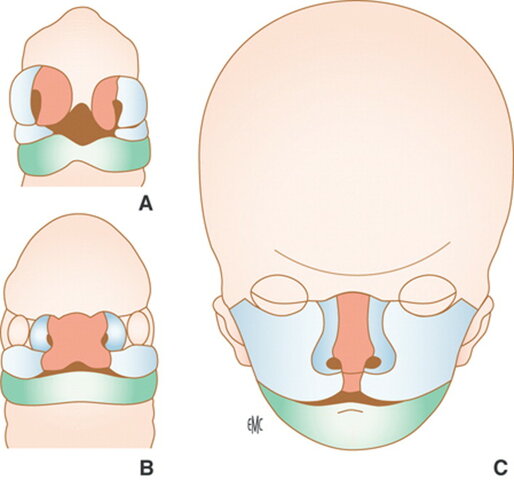 Aquí los procesos nasales mediales y laterales se desarrollan debido a una invaginación de los placoides nasales al mismo tiempo que el ectomesénquima se expande. El proceso medial crece caudalmente para unirse con procesos anteriores y mediales del maxilar en crecimiento, y establecen el paladar primitivo. El proceso nasal medial forma la parte central de la nariz y se desarrolla dentro de la parte central del labio superior. -