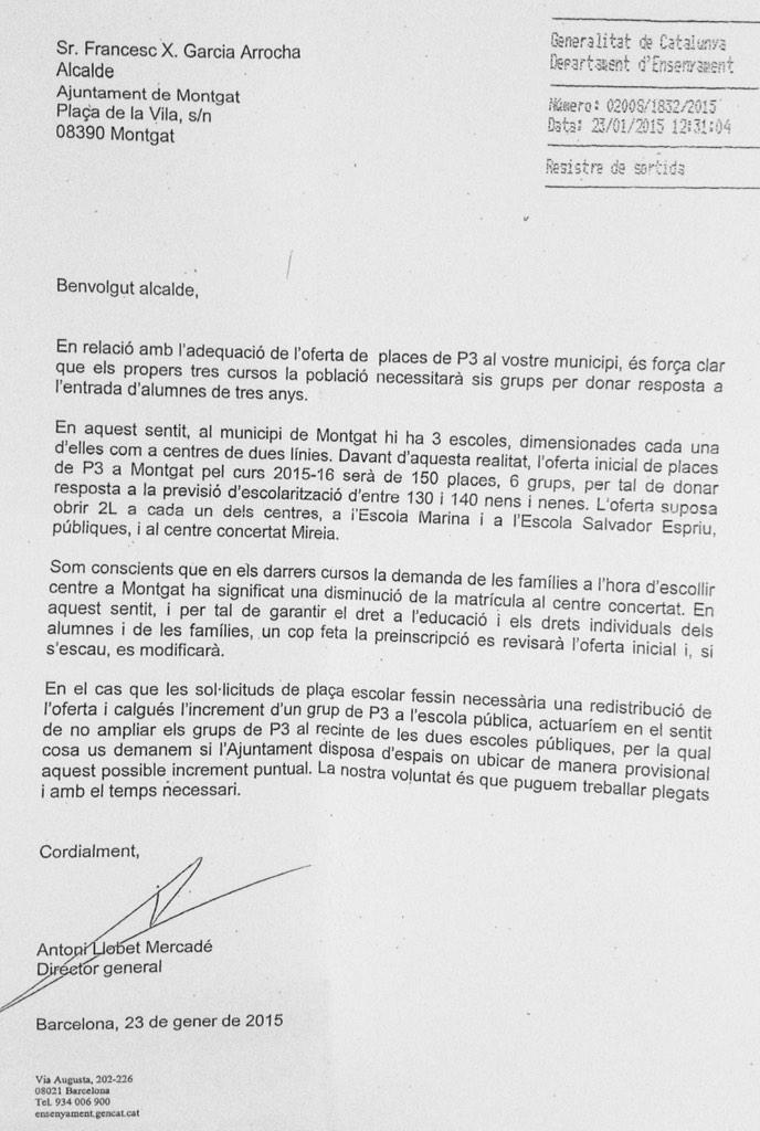 Recordem al Secretari de Polítiques Educatives de la Generalitat (Sr. Antoni Llobet Mercadé) la problemàtica i que l'any anterior ell mateix es va comprometre per escrit a no ampliar els grups a P3 al proper curs. Link text