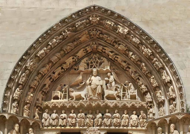 los programas iconográficos románicos ejercieron una gran influencia sobre los góticos, que se convirtieron en una evolución natural de aquellos. Por tanto, la distinción estilística entre la escultura románica y gótica más primitiva, a menudo, es muy sutil. En cuanto a las primeras esculturas góticas, las innovaciones más evidentes se aplicaron en las arquivoltas y las columnas laterales de las portadas. Tímpano de la basílica de Saint-Denis, circa 1137-1144|