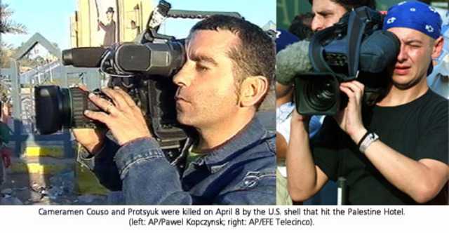 El 8 de Abril, un tanque estadounidense, manejado por el comandante Gibson, disparó en Bagdad un misil contra el Hotel Palestina, en el que se alojaba la prensa internacional. El misil impactó sobre los pisos 14 y 15 del Hotel. En el impacto murió Taras Protsyuk, cámara de Reuters y José Couso, cámara de Telecinco, fue llevado a urgencias y murió en cirugía el mismo día. Imagen tomada de: http://minotauro.periodismohumano.com/files/2010/11/Couso_Protsyuk.jpg