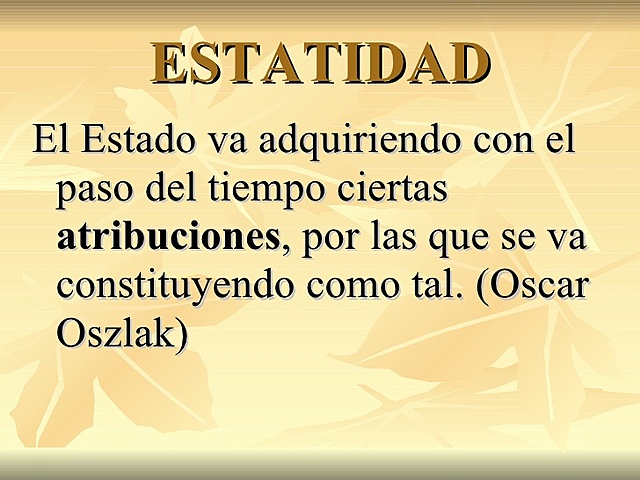 Estatidad: conjunto de atributos que definen la condición de ser estado, es decir el surgimiento de una instancia de organización del poder y de ejercicio de la dominación política.