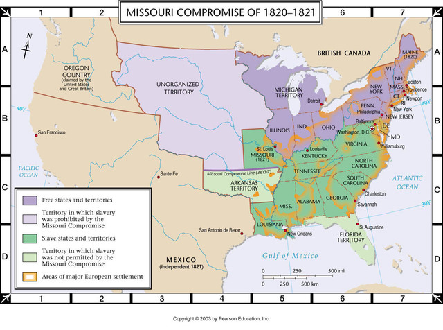 This compromise was introduced when Missouri wanted to be admitted as a state. This addition would throw the balance of power in Congress between slave states and free states. It was decided that Missouri would enter as a slave state. Maine would enter as a free state. Slavery then would not be allowed above the 36-30 parallel.