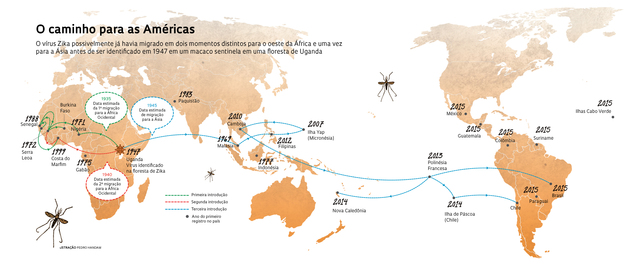 O zika foi identificado, em macacos da floresta de Zika, em Uganda (daí seu nome), provocava apenas infecções esporádicas em humanos, com sintomas “brandos”, como manchas avermelhadas, febre baixa e leve mal-estar. O vírus transmitido por meio de relação sexual e, principalmente, pela picada de mosquitos irmãos do nosso velho conhecido Aedes aegypti, muito parecido com o que transmite a dengue ou a febre amarela urbana. Fonte: Veja.com / Carta Educação