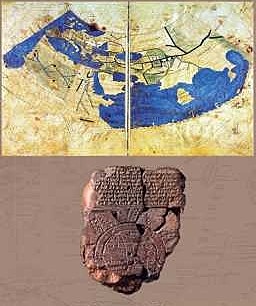 representación muy esquemática, el mundo es dibujado como un disco flotando en el mítico océano. Un mundo prácticamente limitado a la ciudad de Babilonia, que simboliza con un rectángulo alargado, y al río Eúfrates que fluye desde las montañas de Armenia.