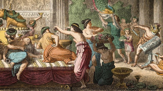 Evento festivo con la finalidad de celebrar bodas, anunciamiento de alguna autoridad y ritos de sacrificio como también con el fin de divertirse, en donde se comía aves, pescado y langosta. El servicio era igual para todos son importar la clase social, la diferencia para los invitados de honor era la porción de alimentos. Se le dio fin a la Grecia clásica y estos eventos en el año 323 a.C.