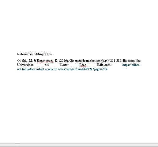 Giraldo, M. & Esparragoza, D. (2016). Gerencia de marketing. (p.p.), 251-280. Barranquilla: Universidad del Norte. Ecoe Ediciones. https://elibro-net.bibliotecavirtual.unad.edu.co/es/ereader/unad/69991?page=269