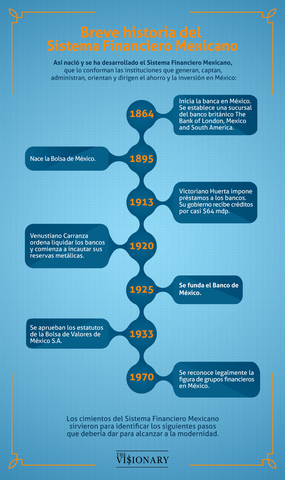 Evolución del Sistema Financiero By facebooker_10158348885166114 Period: 1864 BCE to Jan 1, 1864 Inicia banca en México Se inicia la banca en México. Se establece una sucursal del banco británico The Bank of London, Mexico and South America. Jan 1, 1864 Evolución del Sistema Financiero Mexicano. Se inicia la banca en México. Se abre una sucursal del banco The Bank of London, Mexico and South America.