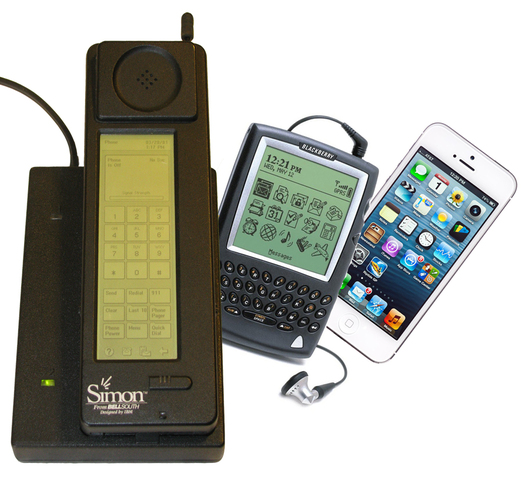Se fabrica el IBM Simon (IBM en conjunto con BellSouth), en 1992, el primer Smartphone de la historia. Se distribuyó en USA entre agosto de 1994 y febrero de 1995 a un precio de 899 dolares. Tenia pantalla táctil LCD monocromo sin botones físicos. Tenía texto predictivo, SMS, correo electrónico, beeper, fax y modem para conexión a internet (comunes de un PDA). Sistema operativo: ROM-DOS, arquitectura x86, archivos Fat32, procesador de 16MHz, registros de 16 bit, 1MB de RAM, 1MB de almacenamiento