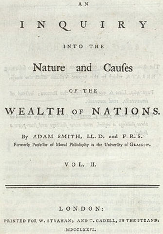 En 1776, publica La riqueza de las naciones, sosteniendo que la riqueza procede del trabajo. El libro fue esencialmente un estudio acerca del proceso de creación y acumulación de la riqueza, tema ya abordado por los mercantilistas y fisiócratas, pero sin el carácter científico de la obra de Smith. Este trabajo obtuvo para él el título de fundador de la economía porque fue el primer estudio completo y sistemático del tema.